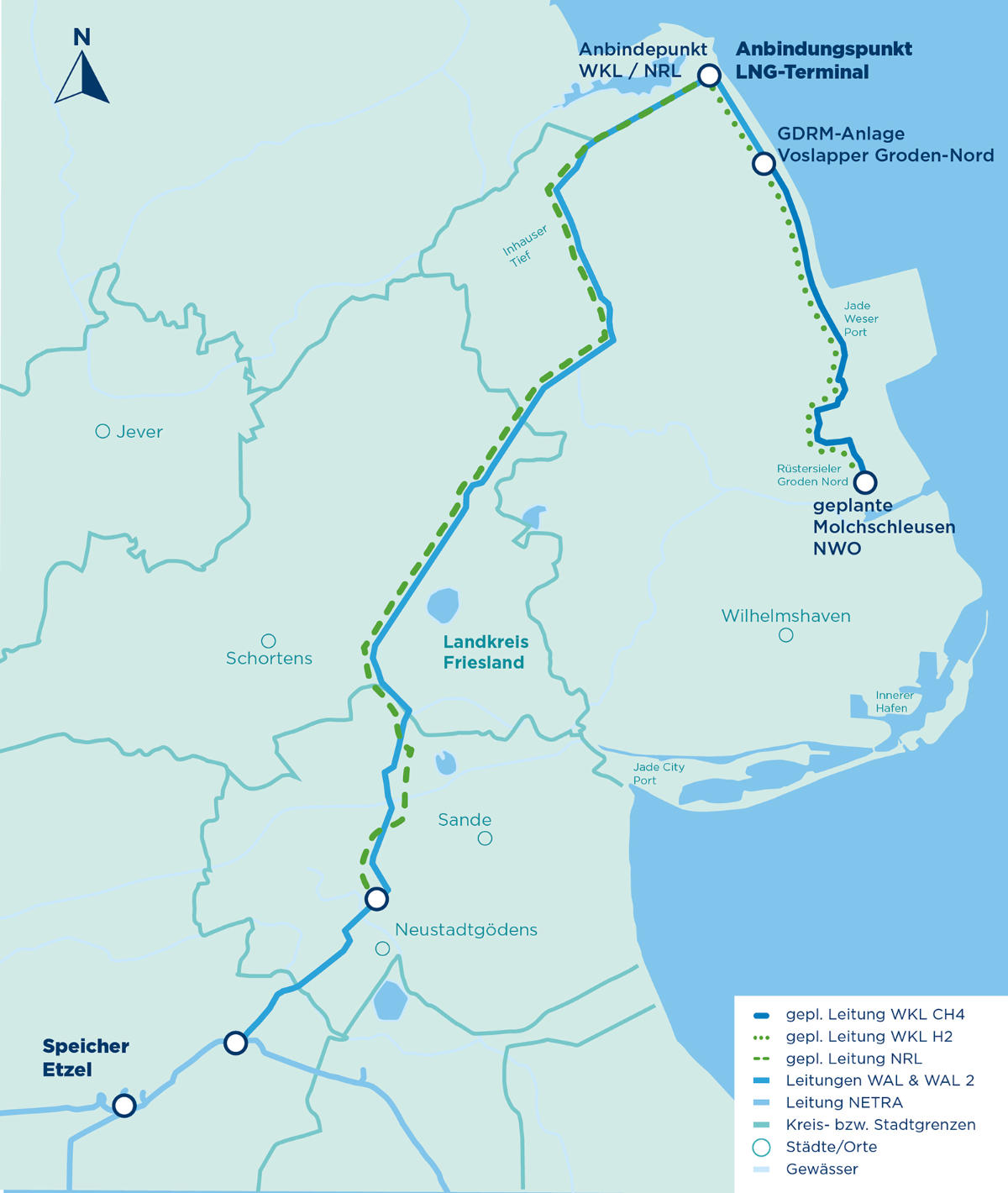 Die Wilhelmshaven-Küstenlinie entlang der Küste von Wilhelmshaven verbindet den wichtigen Nordimportkorridor sowie nationale Produzenten und Abnehmer für Wasserstoff miteinander.