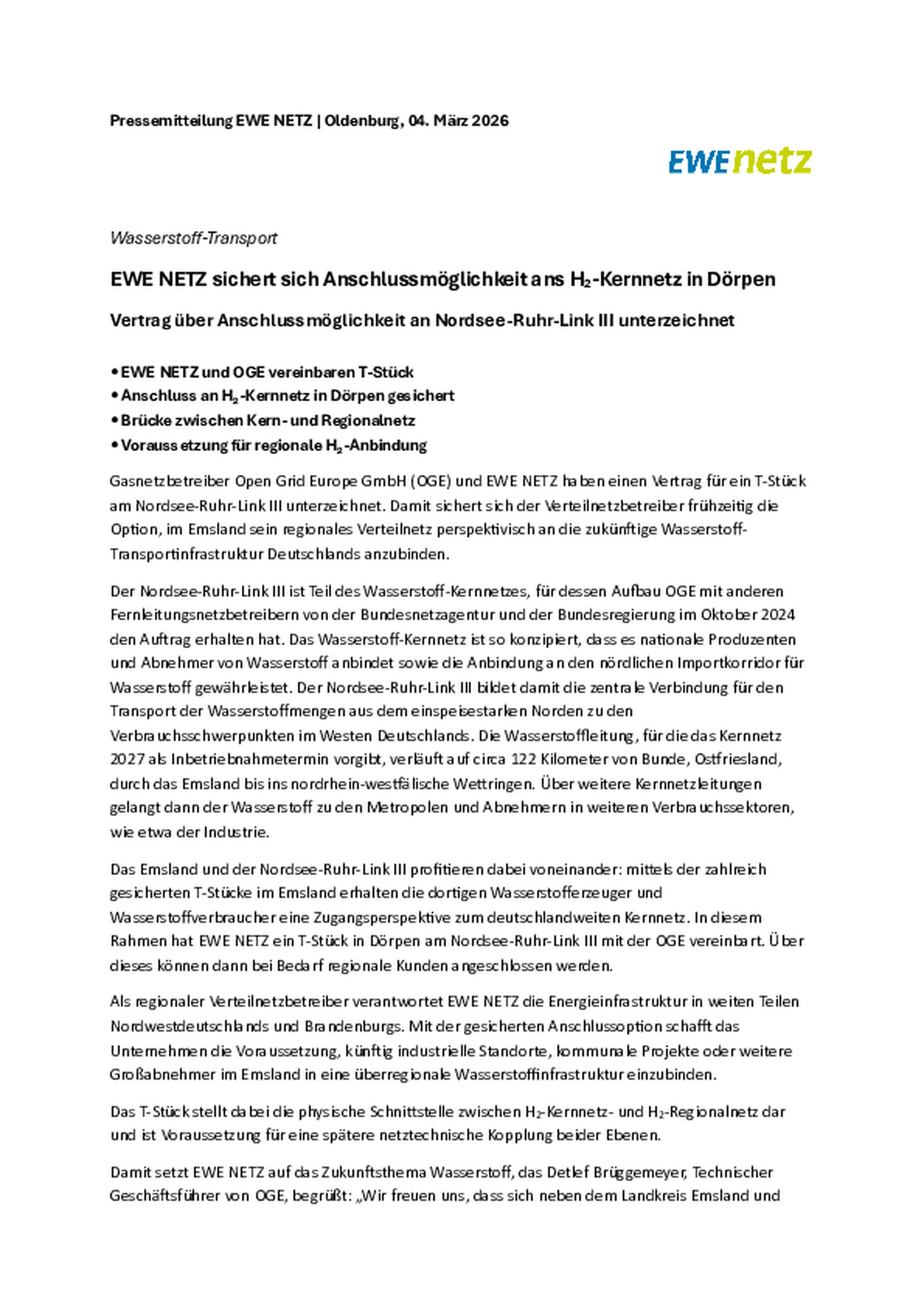 EWE NETZ sichert sich Anschlussmöglichkeit ans H2-Kernnetz in Dörpen