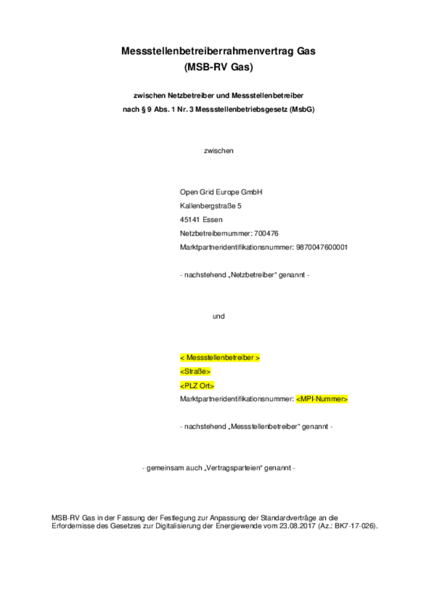 Messstellenbetreiber i.S.d. § 2 Ziff. 12 Messstellenbetriebsgesetz (MsbG) sowie Betreiber von Gasversorgungsnetzen i.S.d. § 3 Ziff. 6 Energiewirtschaftsgesetz (EnWG) sind verpflichtet, neu …abzuschließende Messstellenbetreiberrahmenverträge nach § 9 Abs. 1 Ziff. 3 MsbG gemäß dem Beschluss der Bundesnetzagentur vom 23.08.2017 abzuschließen (Az.: BK7-17-026). Der Beschluss regelt die Anpassung der Standardverträge an die Erfordernisse des Gesetzes zur Digitalisierung der Energiewende. Der hier zum Download zur Verfügung stehende Messstellenbetreiberrahmenvertrag Gas (MSB-RV Gas) entspricht wie gefordert der Änderung des Messstellenrahmenvertrags Gas, festgelegt am 09.09.2017 in dem Verfahren BK7-09-001 zum MSB-RV Gas.