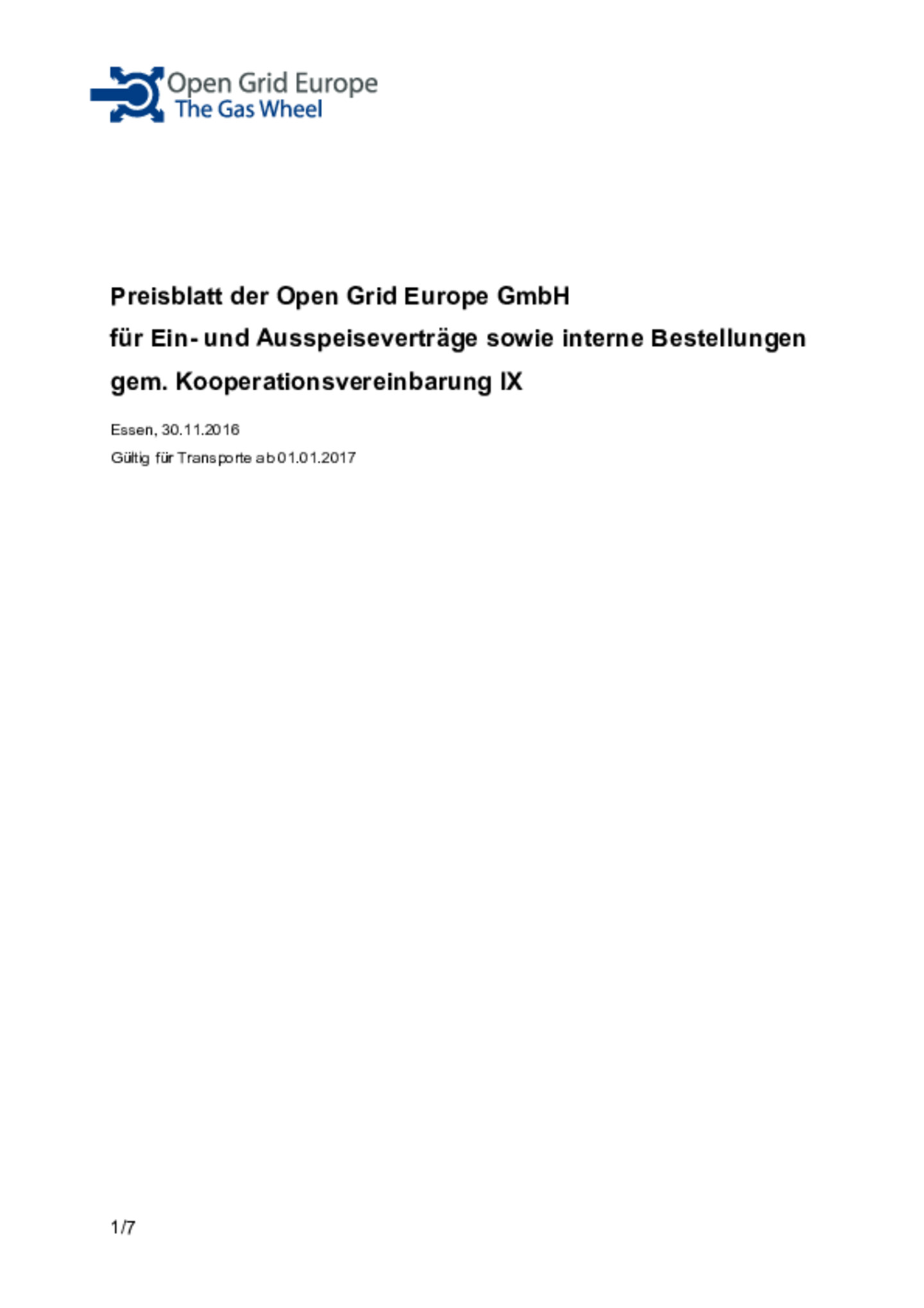 Preisblatt der Open Grid Europe GmbH für Ein- und Ausspeiseverträge sowie interne Bestellungen gem. Kooperationsvereinbarung IX