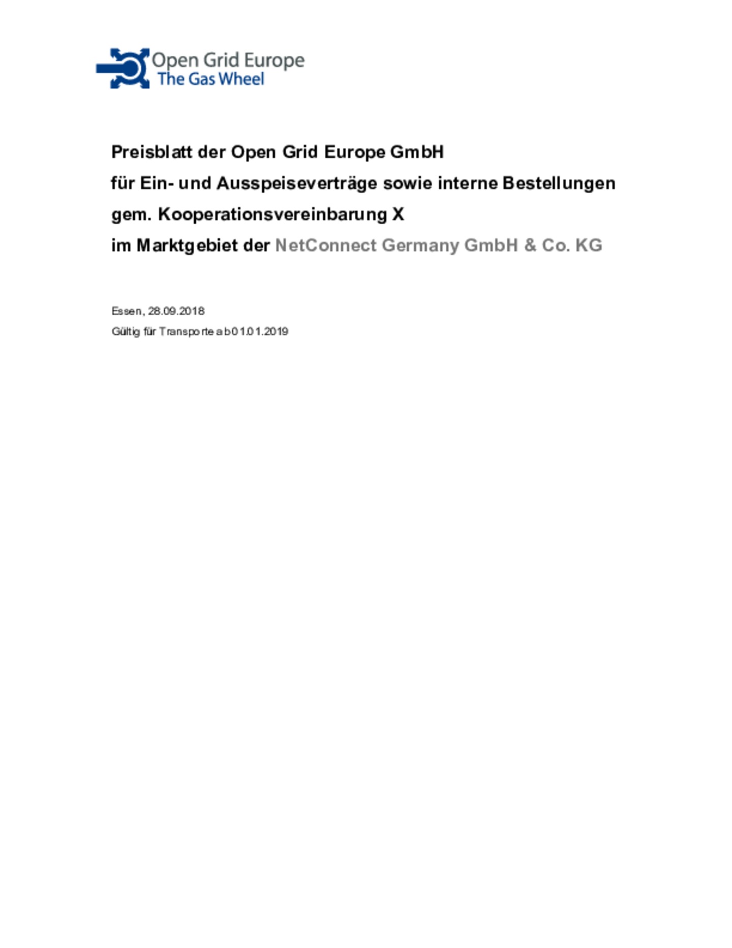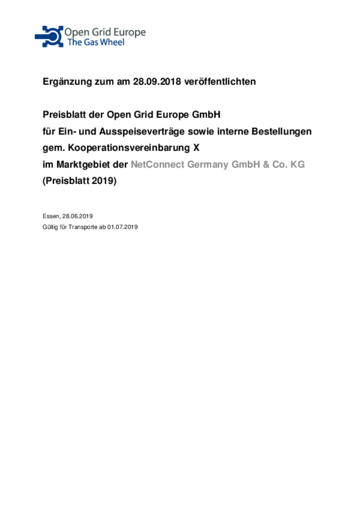 Ergänzung zum am 28.09.2018 veröffentlichten Preisblatt der Open Grid Europe GmbH für Ein- und Ausspeiseverträge sowie interne Bestellungen gem. Kooperationsvereinbarung X im Marktgebiet der NetConnect Germany GmbH & Co. KG (Preisblatt 2019)