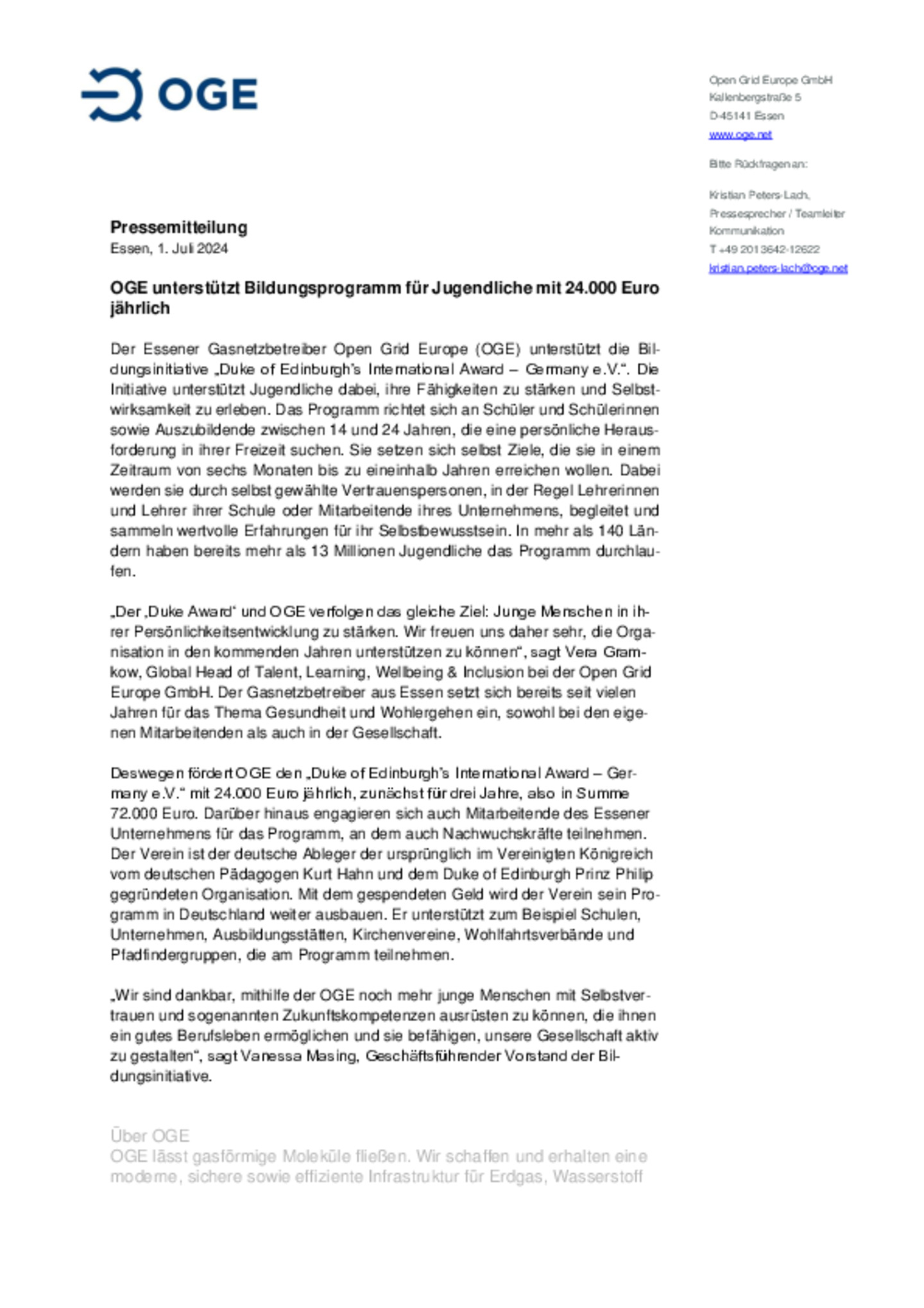 OGE unterstützt Bildungsprogramm für Jugendliche mit 24.000 Euro jährlich
