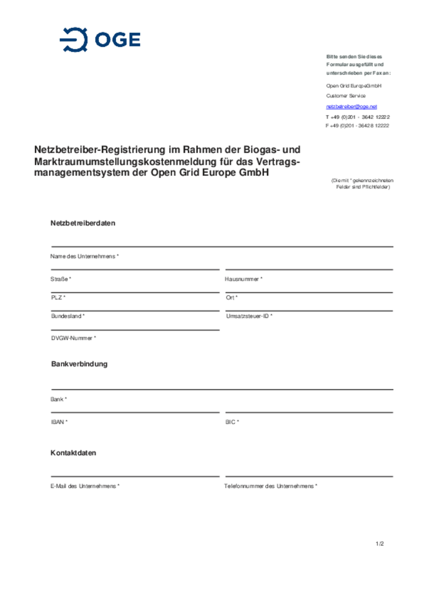 Mindestens erforderliche Angaben zur Prüfung des Anschlusses einer Biogasanlage an das Netz der Open Grid Europe GmbH nach § 33 GasNZV.