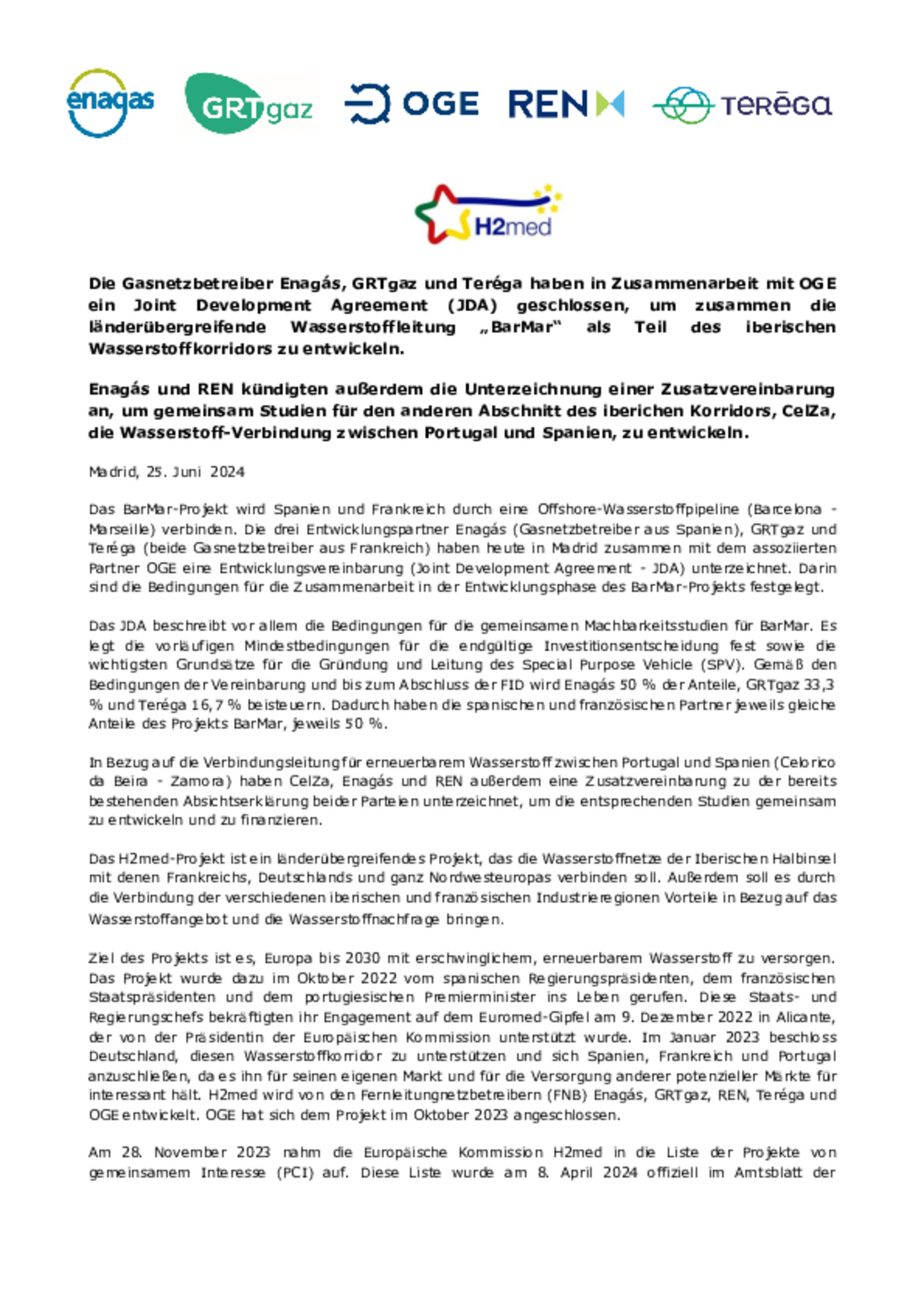 Die Gasnetzbetreiber Enagás, GRTgaz und Teréga haben in Zusammenarbeit mit OGE ein Joint Development Agreement (JDA) geschlossen, um zusammen die länderübergreifende Wasserstoffleitung „BarMar“ als Teil des iberischen Wasserstoffkorridors zu entwickeln.