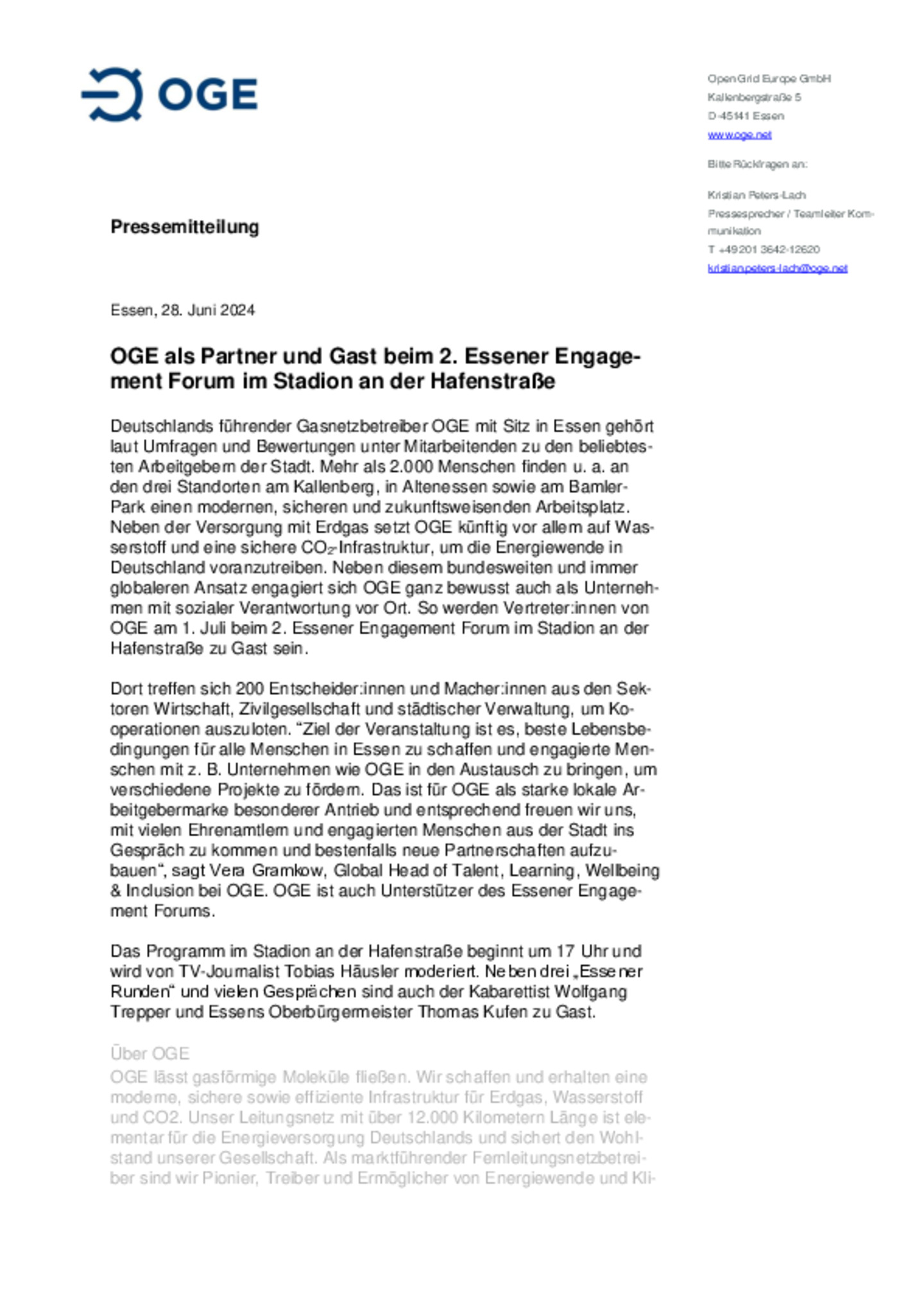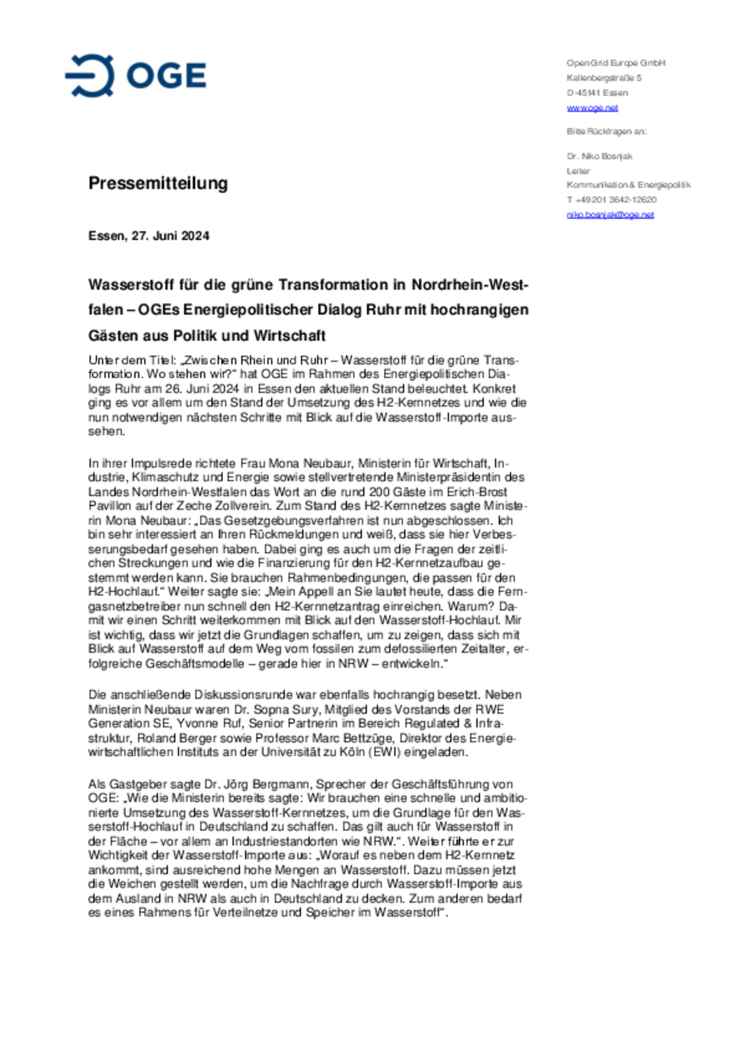 Unter dem Titel: „Zwischen Rhein und Ruhr – Wasserstoff für die grüne Trans-formation. Wo stehen wir?“ hat OGE im Rahmen des Energiepolitischen Dialogs Ruhr am 26. Juni 2024 in Essen den aktuellen Stand beleuchtet. Konkret ging es vor allem um den Stand der Umsetzung des H2-Kernnetzes und wie die nun notwendigen nächsten Schritte mit Blick auf die Wasserstoff-Importe aussehen.
