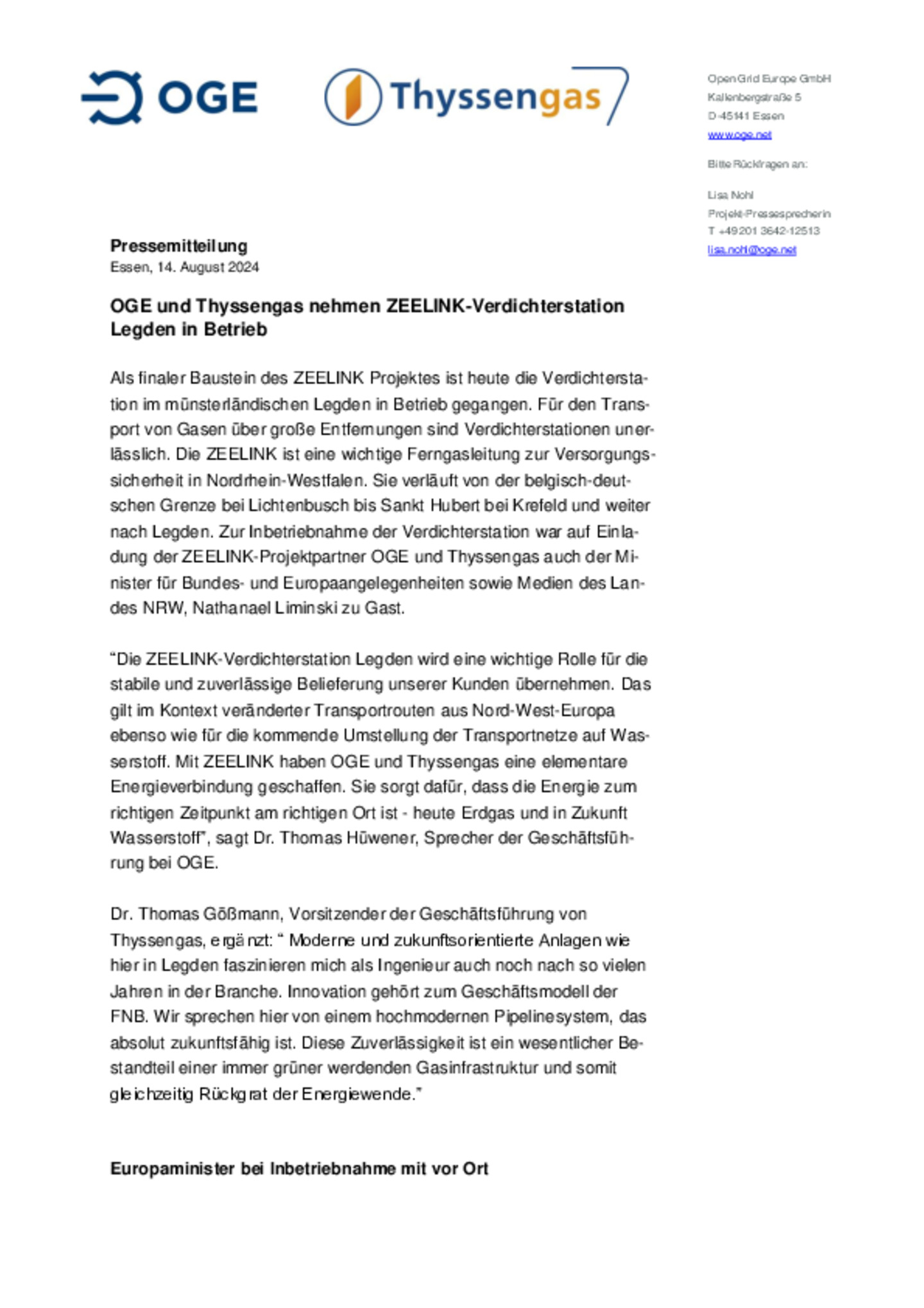 OGE und Thyssengas nehmen ZEELINK-Verdichterstation Legden in Betrieb