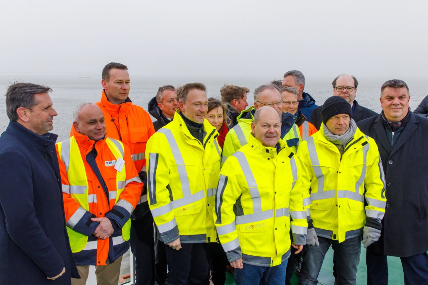 • Bundeskanzler Olaf Scholz, Ministerpräsident Stephan Weil, Bundeswirtschaftsminister Robert Habeck sowie Bundesfinanzminister Christian Lindner kommen zur Eröffnung der Anlagen an die Nordseeküste