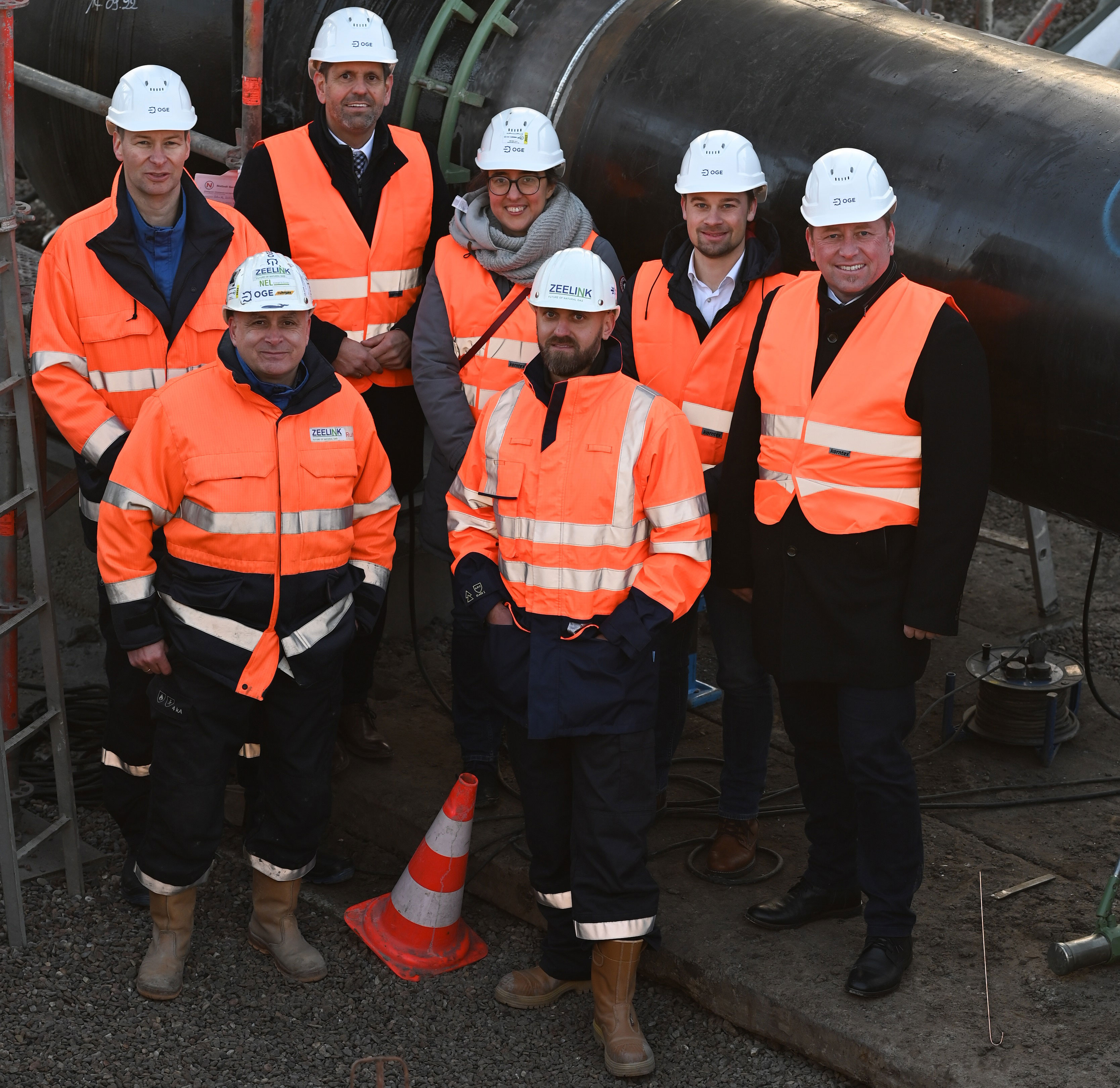 v. l.: Thomas Hüwener (Mitglied der Geschäftsführung OGE), Franz-Josef Kissing (Projektleiter WAL, OGE), Olaf Lies (Minister für Wirtschaft, Bauen, Verkehr und Digitalisierung des Landes Niedersachsen), Anka Dobslaw (Staatssekretärin im Niedersächsisches Ministerium für Umwelt, Energie und Klimaschutz), Christoph Köhler (kaufmännische Projektleiter WAL, OGE), Malte Tammeus (Dezernent Landkreis Wittmund) und Helfried Goetz (Bürgermeister Gemeinde Friedeburg).