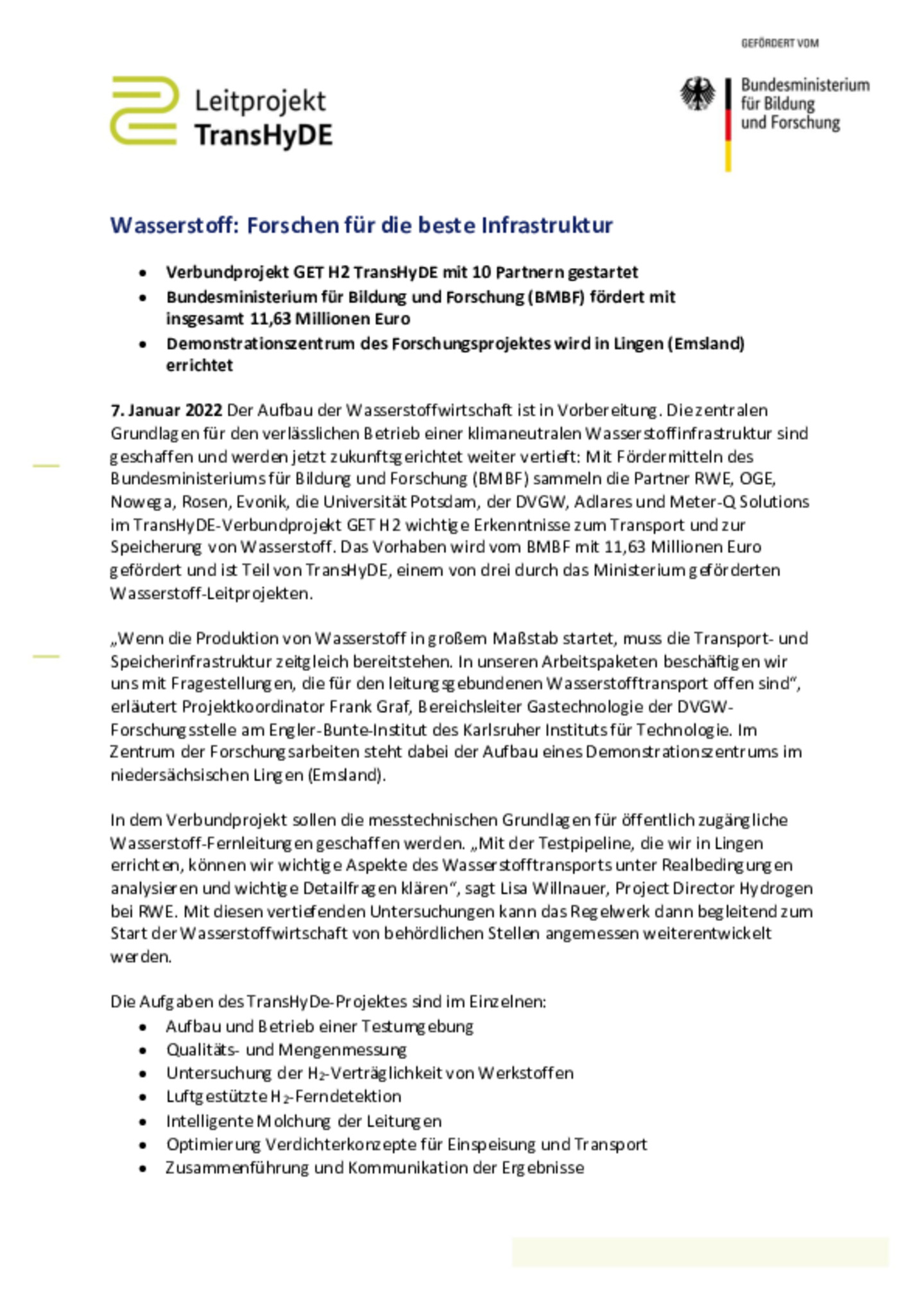„GET H2 TransHyDE“ ist eines von vier Demonstrationsprojekten innerhalb des Leitprojekts TransHyDE, in dem es um Transport-Technologien für Wasserstoff geht. Mit zwei weiteren Leitprojekten bilden sie die größte Förderinitiative des BMBFs zum Thema Energiewende überhaupt und setzen so einen entscheidenden Impuls für Deutschlands Einstieg in die Wasserstoffwirtschaft.