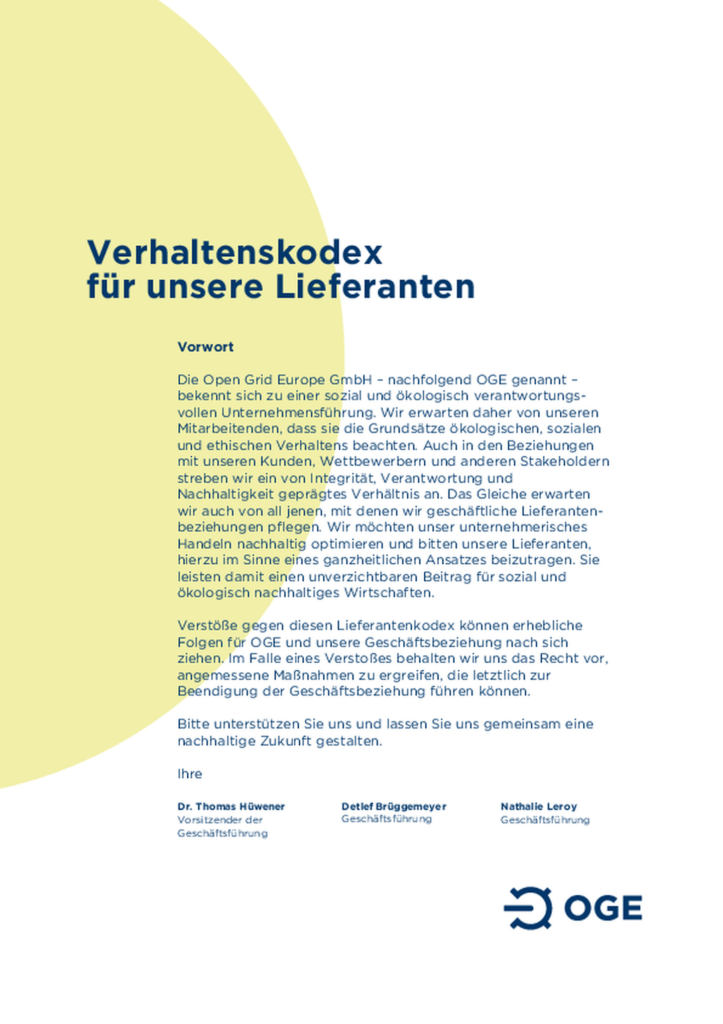 OGE hat zum gemeinsamen Verständnis über diese Standards einen Verhaltenskodex für Lieferanten erstellt. Als klares Bekenntnis zur Einhaltung stimmen Sie den Inhalten dieses Verhaltenskodex zu und adressieren die Themen in angemessener Art und Weise in Ihren eigenen Lieferketten.