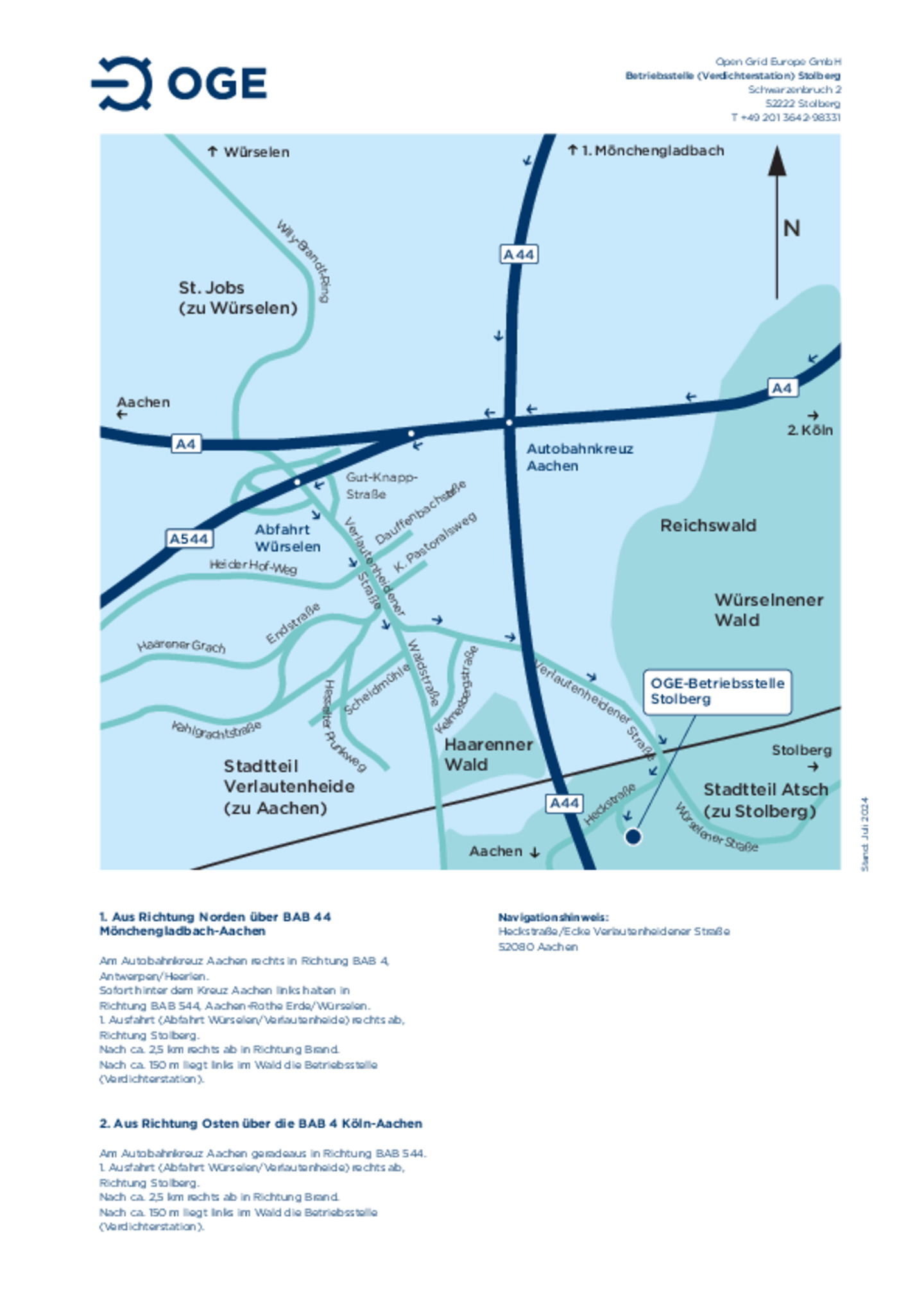 Anfahrtsskizze zur Betriebsstelle und Verdichterstation Stolberg