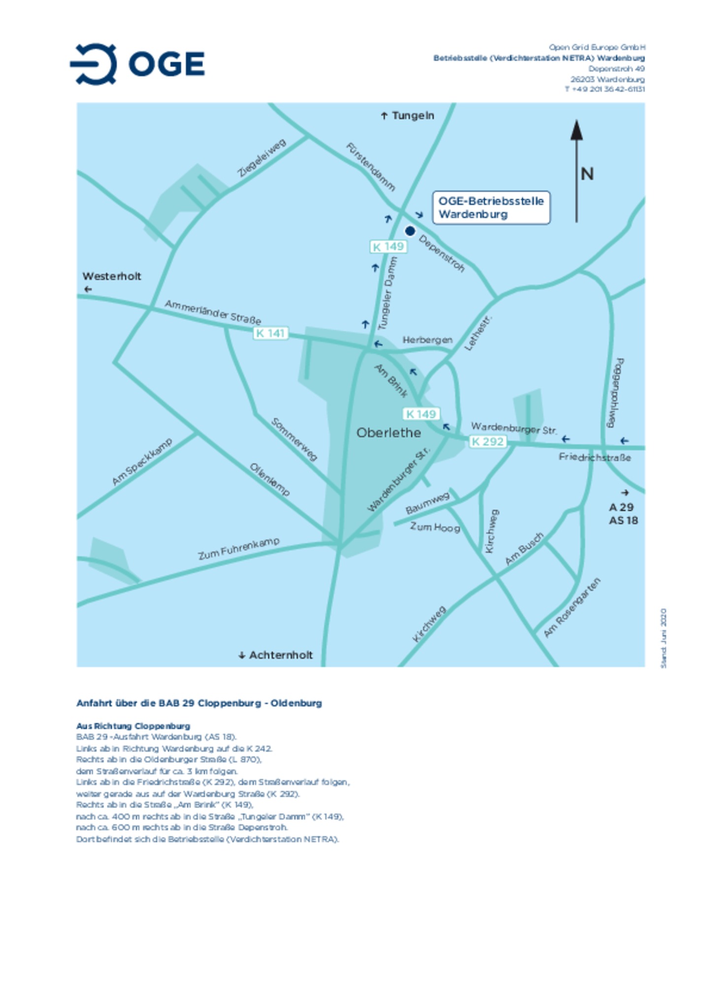Anfahrtsskizze zur Betriebsstelle und Verdichterstation Wardenburg