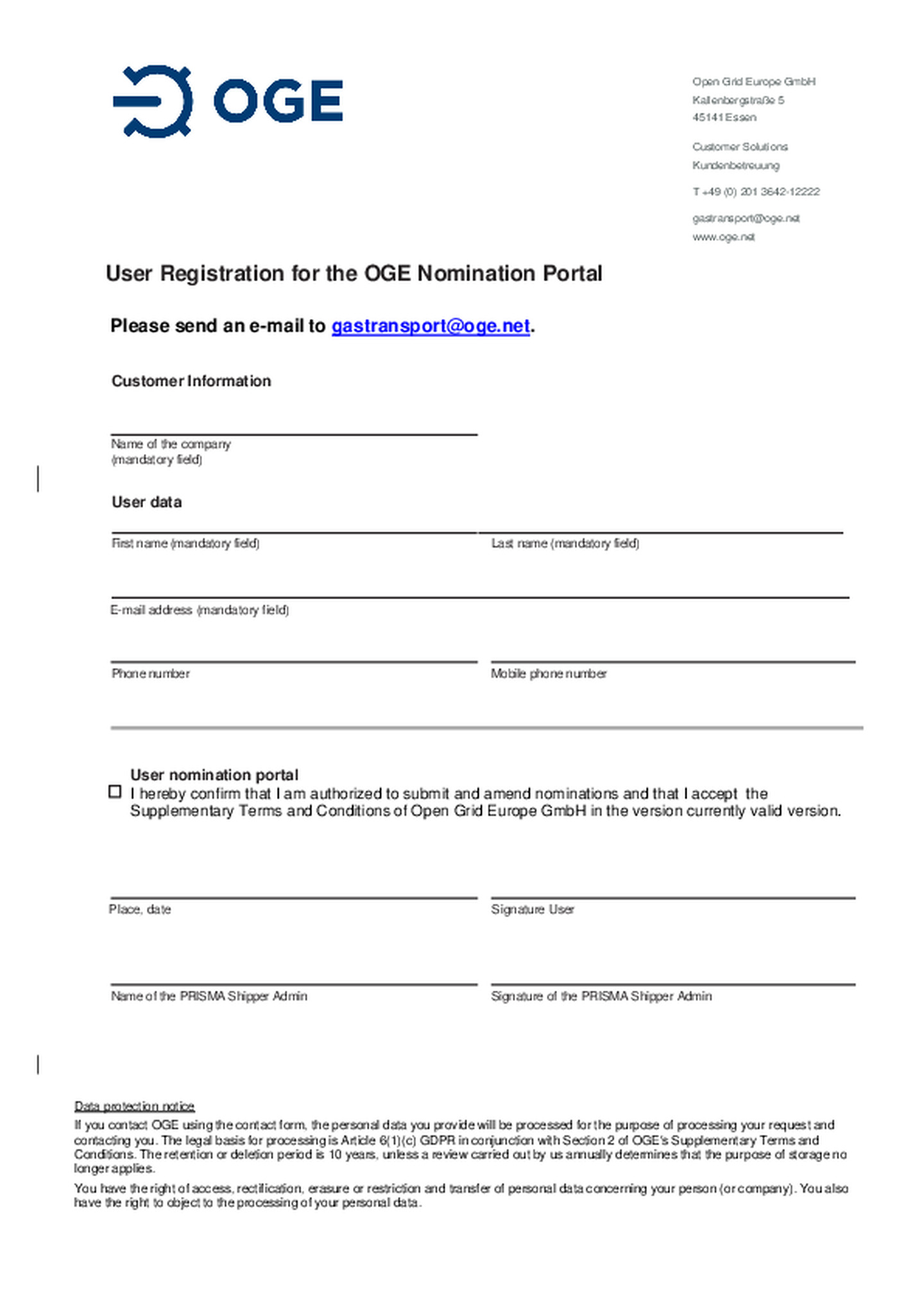 - If you require exclusive access to the nomination portal, please send the completed registration form also to us by using the contact form for Shipper registration