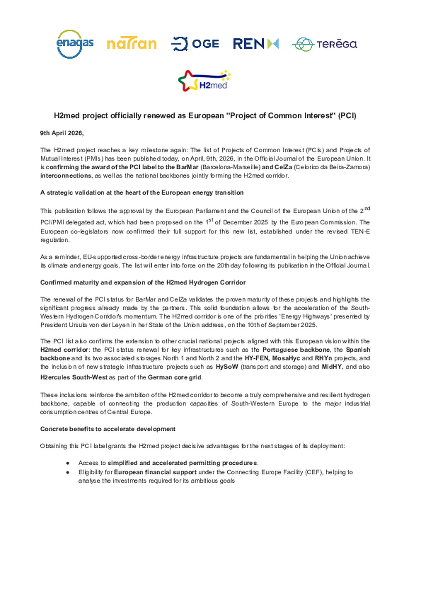 The H2med project reaches a key milestone again: The list of Projects of Common Interest (PCIs) and Projects of Mutual Interest (PMIs) has been published on April, 9th, 2026 in the Official Journal …of the European Union. It is confirming the award of the PCI label to the BarMar (Barcelona-Marseille) and CelZa (Celorico da Beira-Zamora) interconnections, as well as the national backbones jointly forming the H2med corridor.