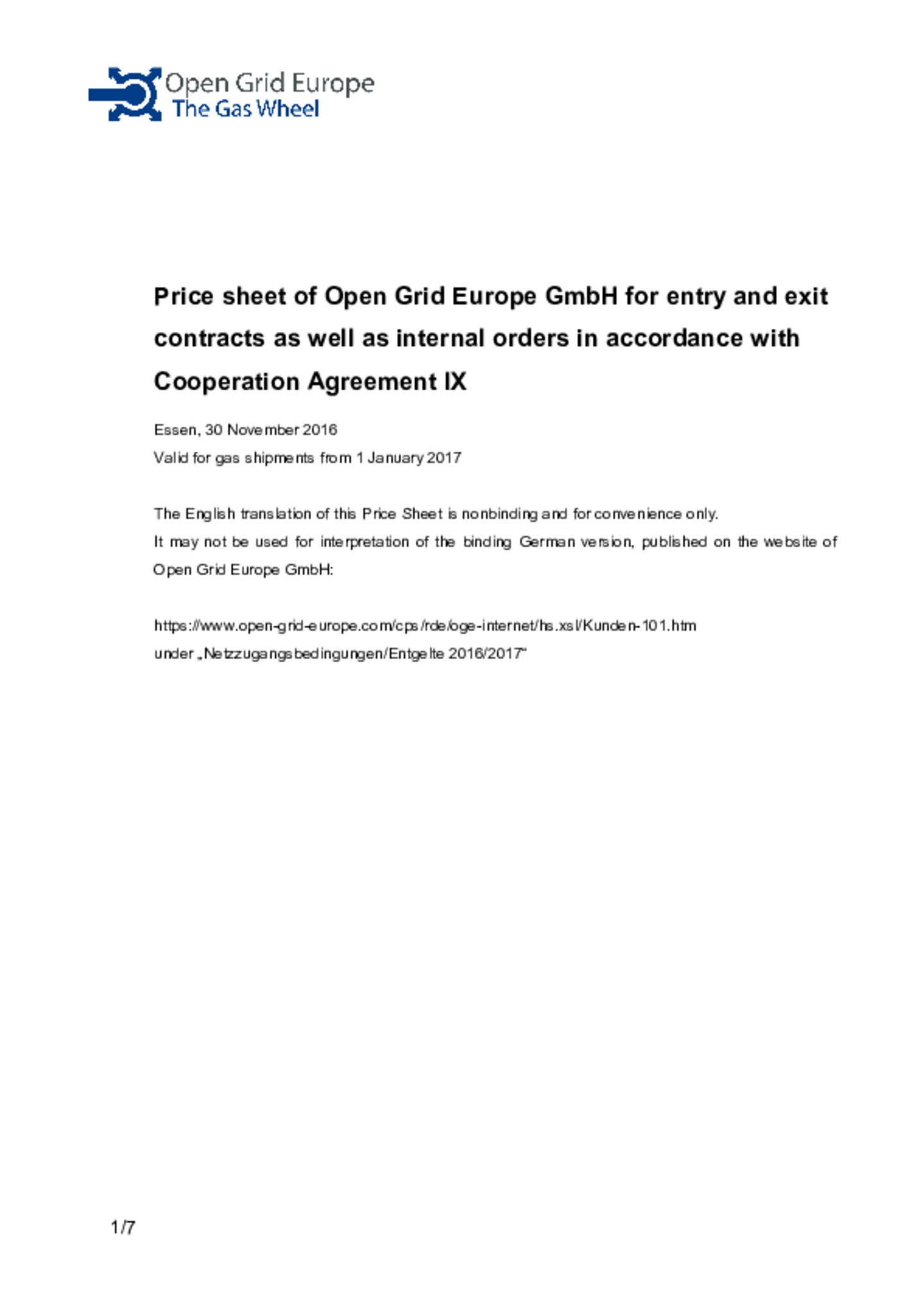 NCG Price sheet of Open Grid Europe GmbH 2017