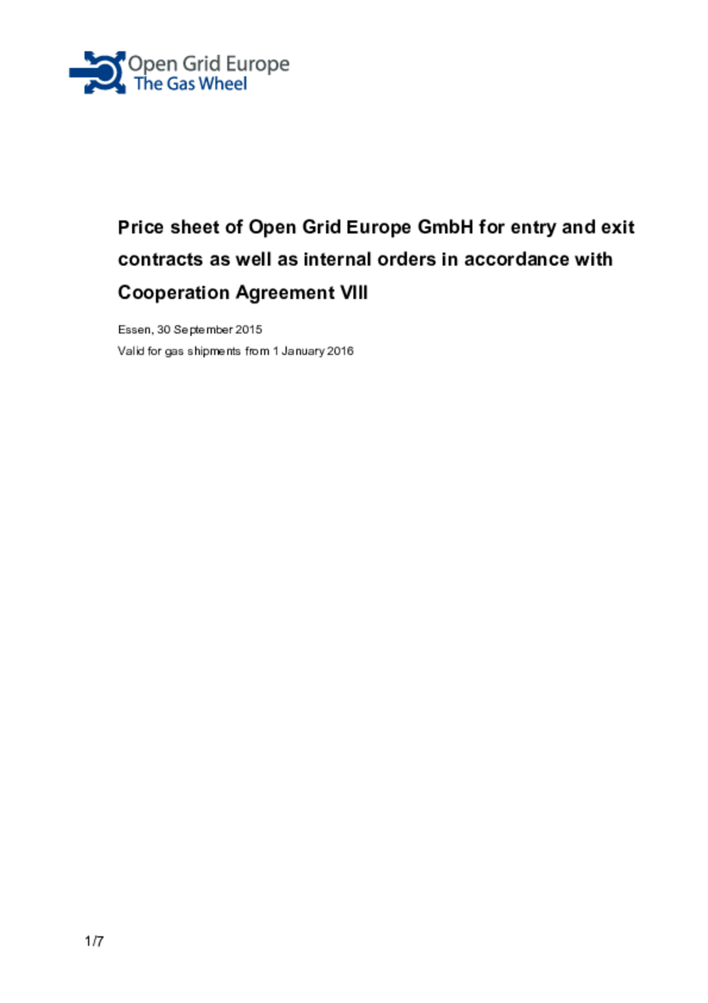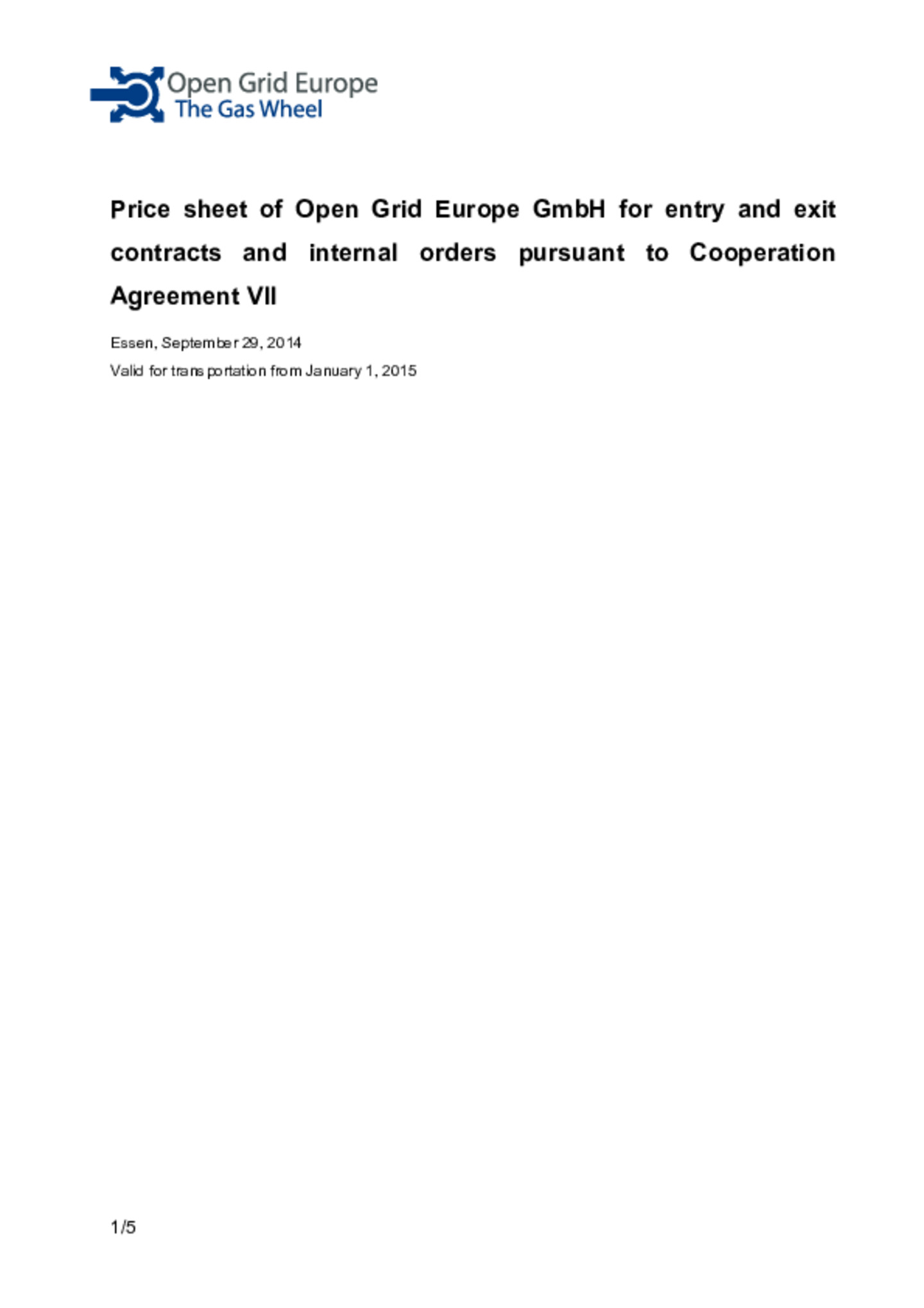 NCG Price sheet of Open Grid Europe GmbH 2015