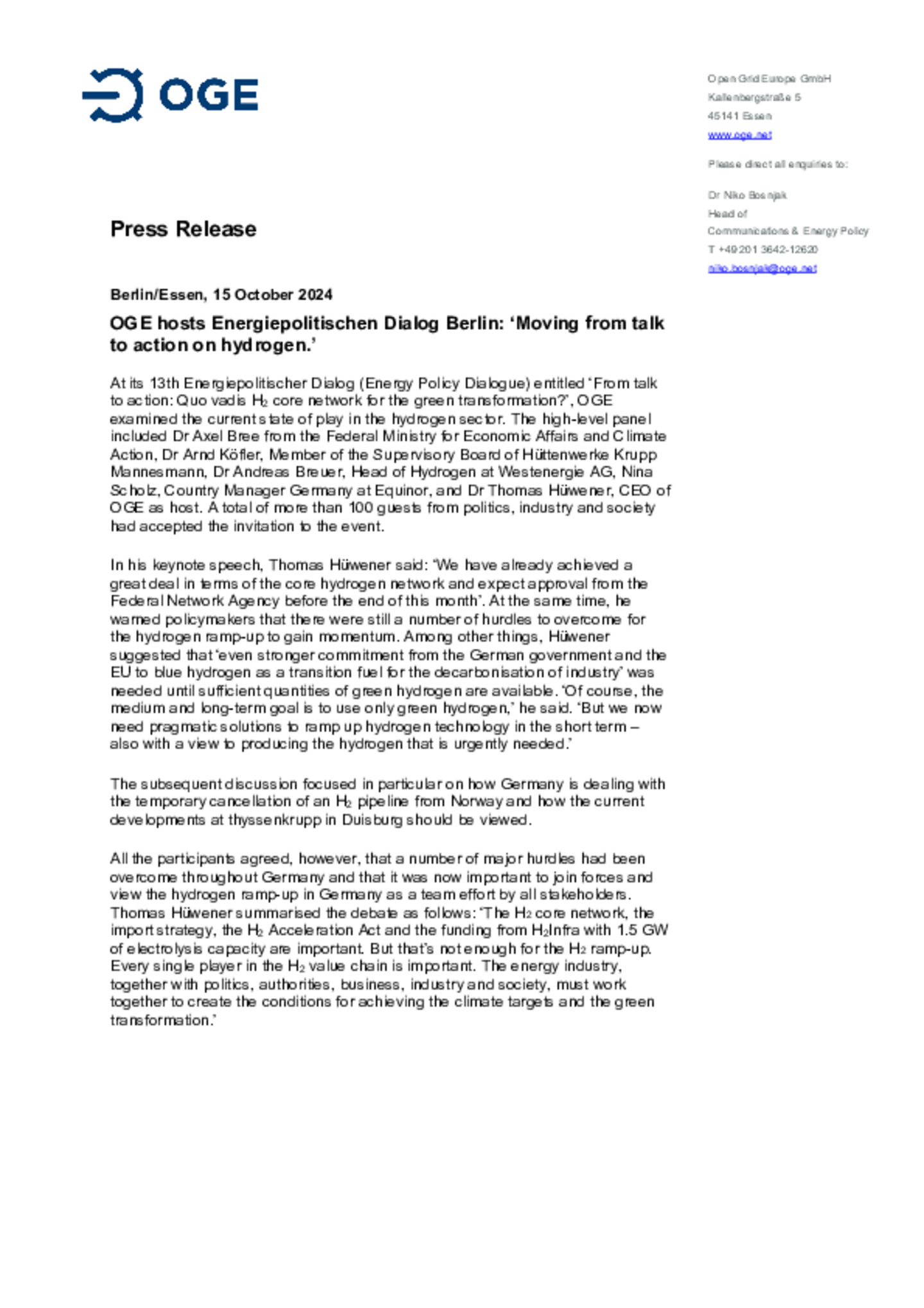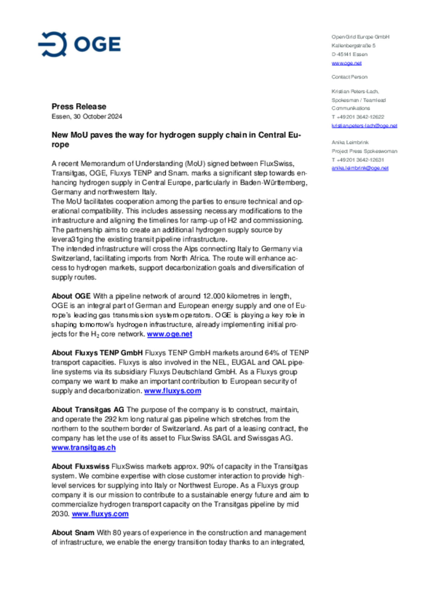 Hydrogen for Essen from Germany’s nationwide H2 core network: Stadtwerke Essen and OGE in partnership
