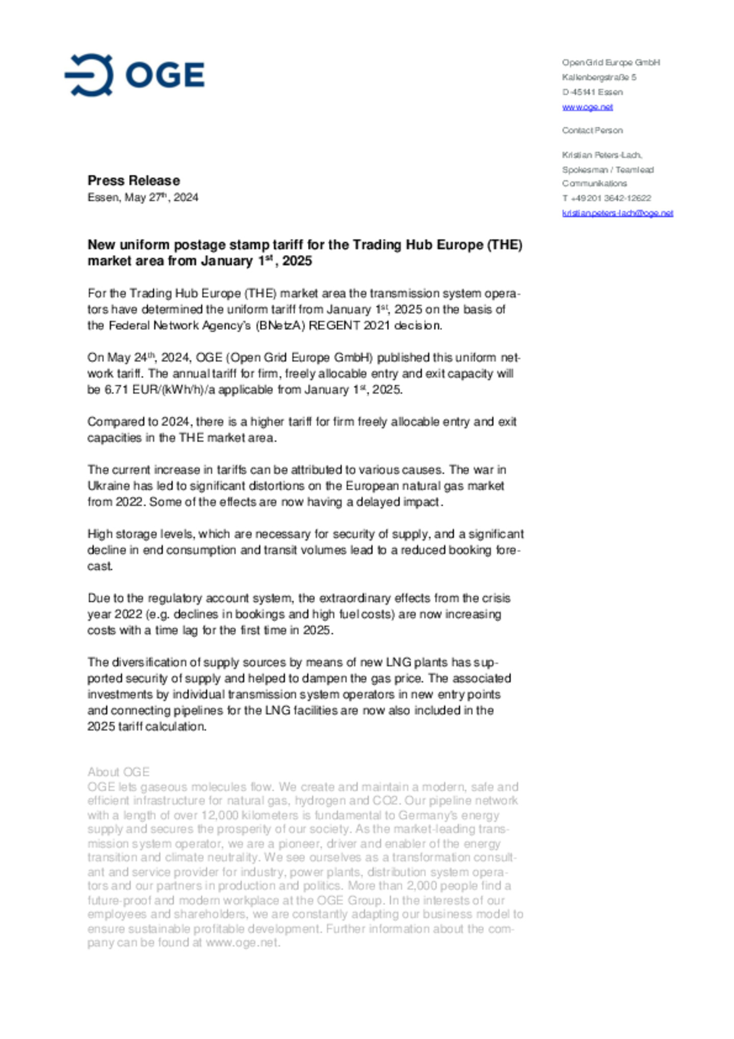 New uniform postage stamp tariff for the Trading Hub Europe (THE) market area from January 1st , 2025