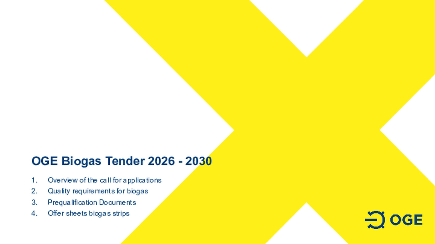 All interested gas traders are invited to participate in this tender. Detailed information regarding participation and delivery conditions, as well as applicable deadlines, can be found in the PDF document “Biogas Tender 2026–2030” and the underlying OGE Biogas Supply Agreement, both available for download at the bottom of the webpage.