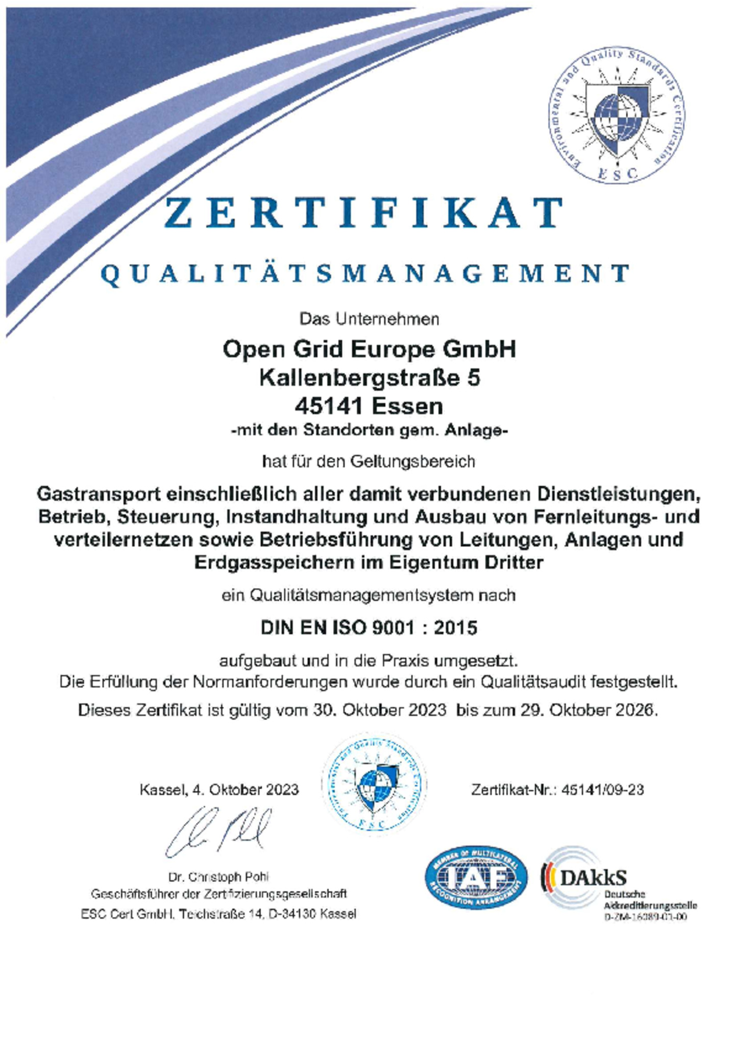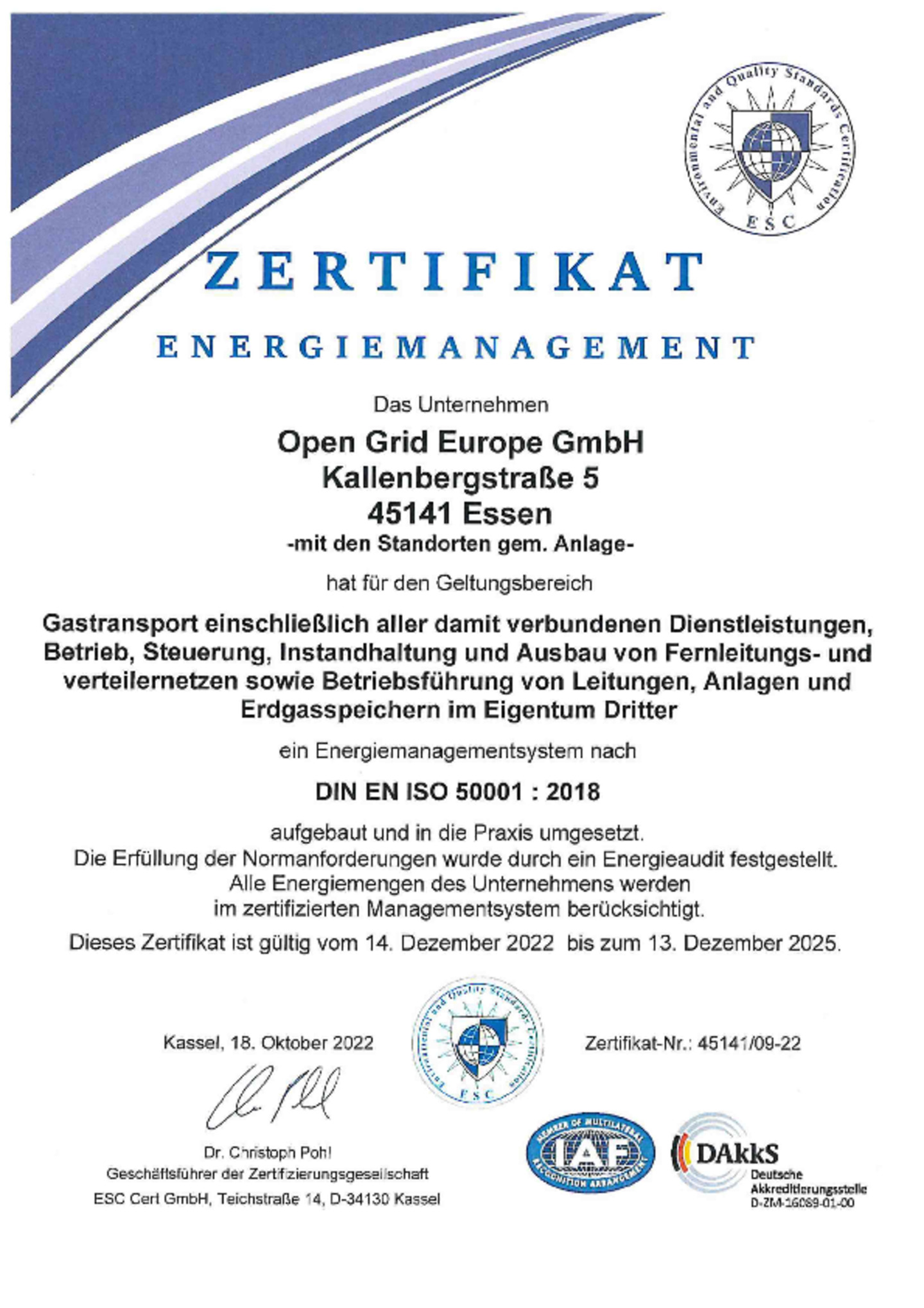 The certificates awarded to OGE confirm that our integrated QSE system meets all the requirements arising from legislation and applicable technical codes and standards, including DIN EN ISO 9001 for quality, DVGW Code of Practise G 1000 for technical safety management, the DIN ISO 45001 for health and safety, as well as DIN EN ISO 50001 for energy efficiency and DIN EN ISO 14001 for environmental matters.